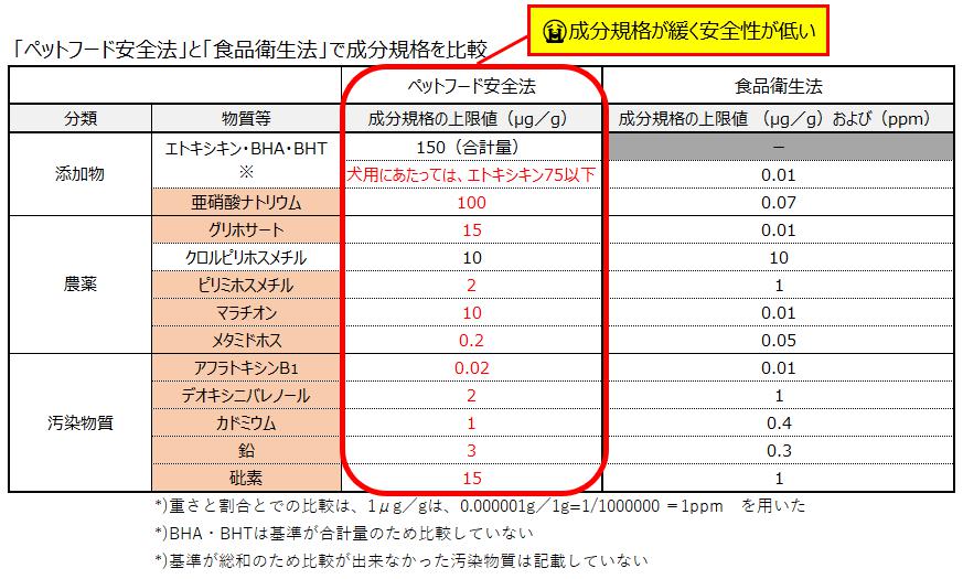 食品衛生法と比べて、ペットフード安全法がどれだけ緩いのか?が一目瞭然です。