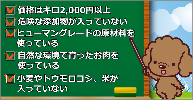 結果的には最低でも、1kgあたり2,000円以上するドックフードじゃないと、わが子の口にいれても良い!と思える品質ではありませんでした。
